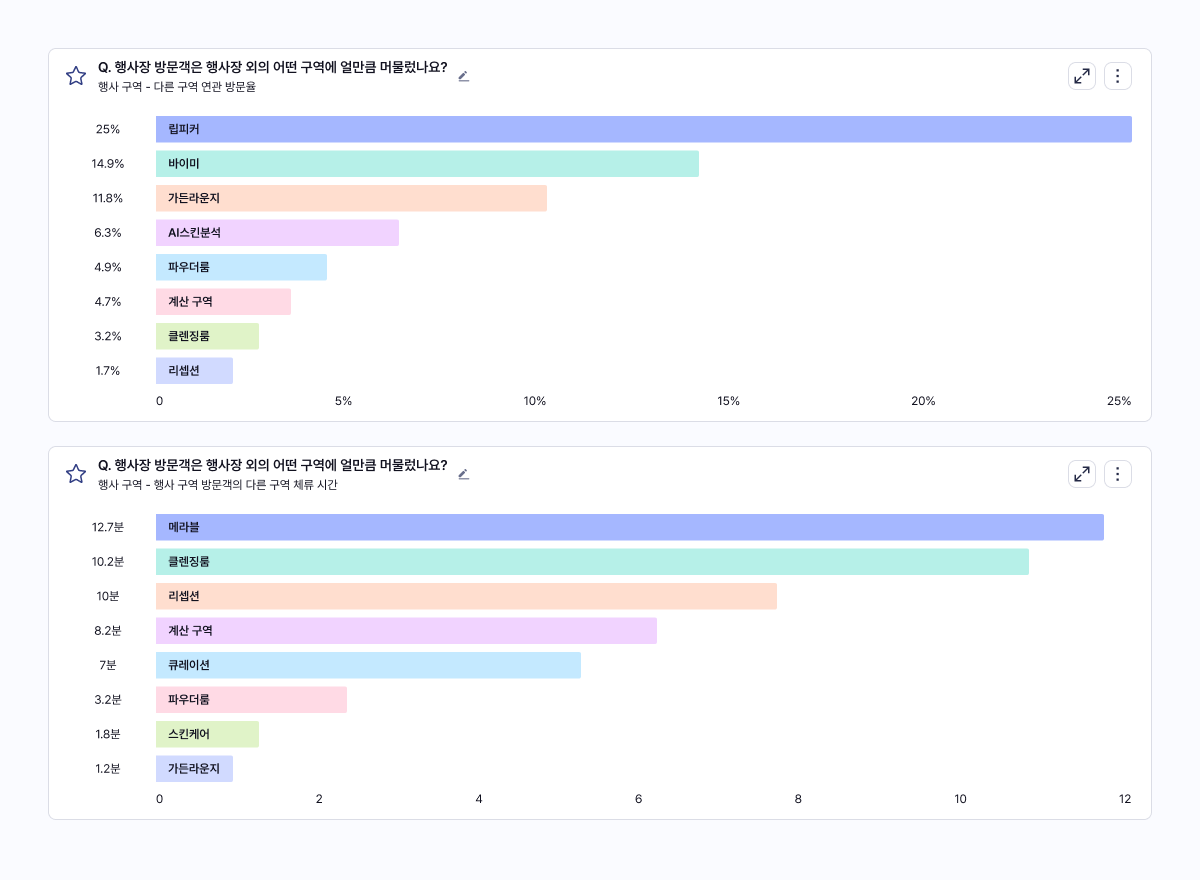 실제로 A 팝업스토어의 경우, 행사 구역 방문객의 약 83%가 아모레성수의 다른 구역을 관심 있게 살펴본 것으로 나타났습니다. 팝업스토어 구역을 벗어난 후에는 클렌징 제품 체험존(클렌징 룸), 계산대, 아이 메이크업 제품존 순으로 많이 이동했고요. 체류 시간이 높았던 구역으로는 퍼스널 립 제품을 만드는 구역(립피커), 여러 메이크업 제품을 체험할 수 있는 파우더룸, 휴식을 취할 수 있는 가든라운지 등으로 나타났습니다.