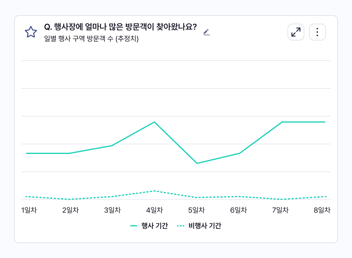 ‘행사 구역 방문객 수’ 지표를 참고하면 집객 효과를 간접적으로나마 확인할 수 있습니다. 행사 구역 방문객 수는 행사가 진행되고 있는 구역에 일정 시간 이상 머무른 사람의 수를 측정한 데이터거든요. 누군가 특정한 장소에 오래 머물렀다면, 그곳에 있는 상품이나 거기서 진행되는 행사에 관심이 있었다고 해석할 수 있기 때문입니다.