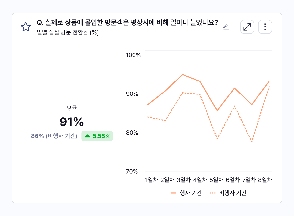 그렇다면 매력적인 행사로 증명된 A 팝업스토어의 일 평균 실질 방문 전환율은 어땠을까요? 무려 91%로 확인되었습니다. 행사 기간이 아닐 때에 비해 약 5.6% 증가한 수치인데요. 이로 미루어 볼 때 A 팝업스토어는 고객에게 색다른 경험을 제공하고자 했던 목적도 달성한 것으로 해석됩니다.