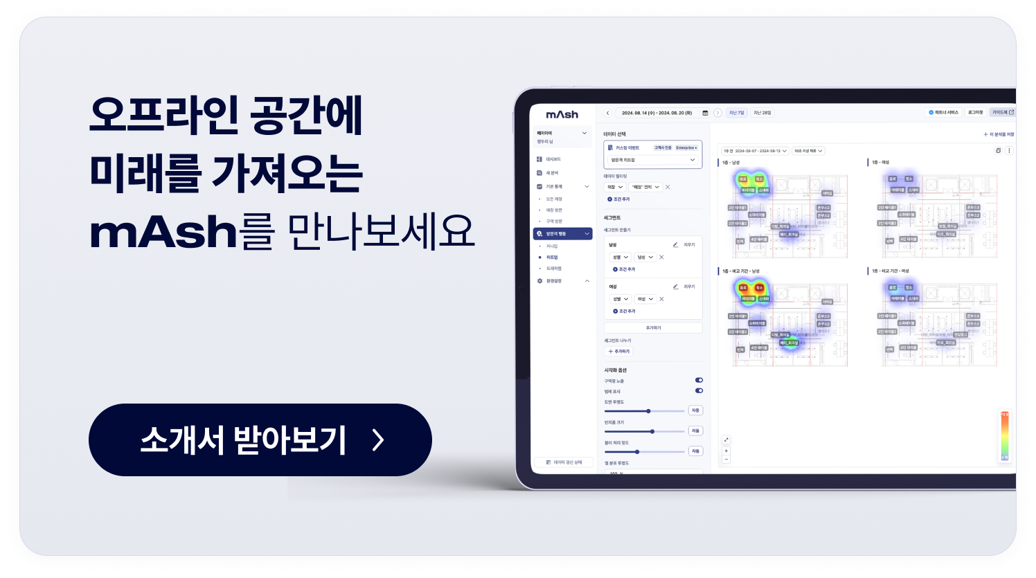 오프라인 매장 방문객 솔루션 매쉬(mAsh)도 이렇게 쓸 수 있습니다. 감에만 의존해 알 수 없던 매장 데이터를 알아내고, 데이터 기반 의사결정을 할 수 있습니다. 여기에 매장 직원이 그간 체감한 인사이트를 더하면 더 탄탄한 전략을 세울 수 있고요. 자사 매장의 첫 번째 리테일 AI로 매쉬를 도입해보세요. 아래 버튼을 누르면 자세한 설명이 담긴 서비스 소개서를 읽어볼 수 있습니다. 자세한 상담이 필요한 분들은 우측 하단 채널톡 또는 contact@may-i.io로 연락 부탁드립니다.
