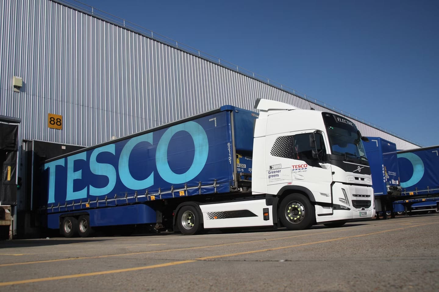테스코의 물류 컨테이너를 실은 기차와 대형 트럭의 모습. ⓒTesco, Volvo