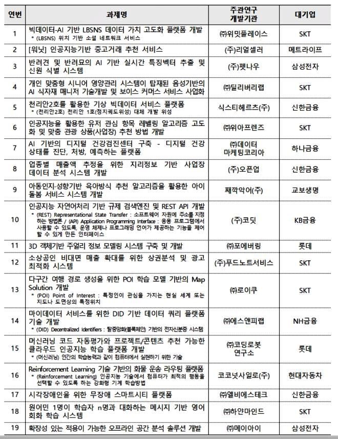 대기업은 SKT, 삼성전자, 현대자동차, 신한금융, 롯데, KB금융, 교보생명, 하나금융, NH금융, 메트라이트 등이 참여한다. SKT는 5G 기반 네트워크 실증 환경을 제공하고 금융 분야 대기업은 금융 플랫폼 기반의 API-데이터를 제공하는 등 R&D 역량 강화와 판로개척, 투자연계 등을 지원한다. 이를 통해 사업화 성공률 제고에 기여하겠다는 계획이다.