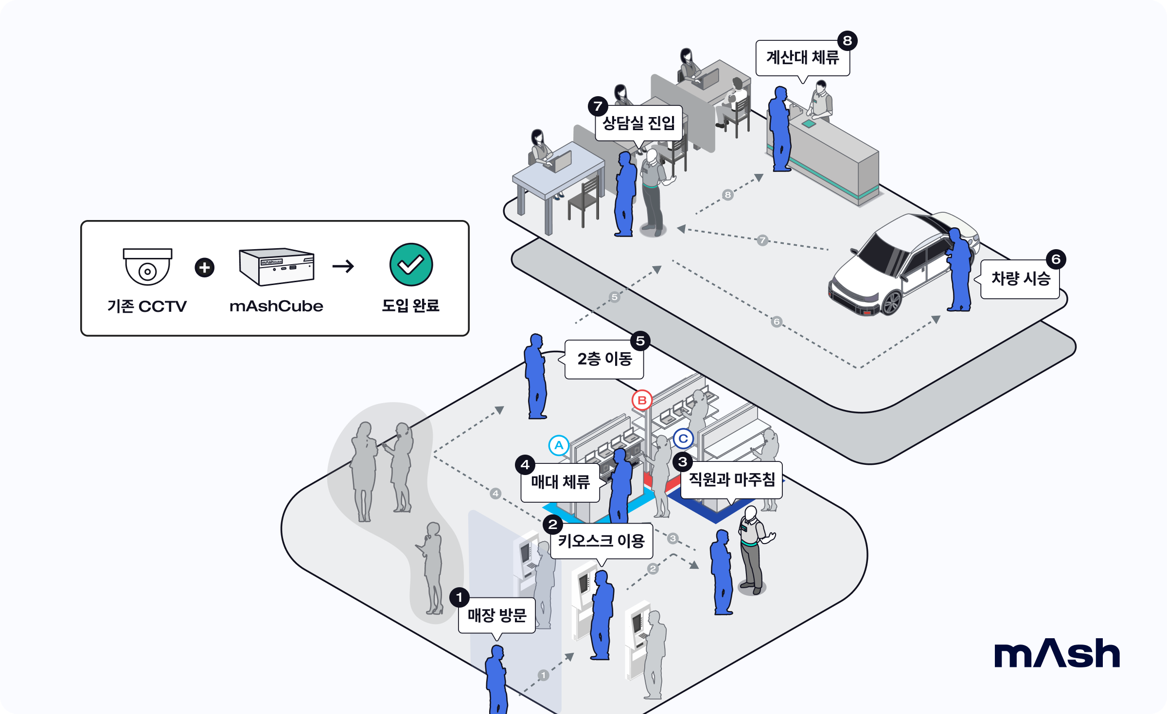 A. 매쉬는 매장에 설치된 폐쇄회로(CC)TV 영상으로 방문객 데이터를 측정하여 매장의 성과를 분석하는 영상처리 인공지능 솔루션이다. 매장에 출입한 사람의 수, 성별, 나이, 동선을 파악하는 것은 물론 방문객과 상품 또는 직원 사이의 인터랙션, 매장 내 구역과 구역 간의 연관 관계 등을 분석한다. 고객사는 이런 데이터를 매장 운영 전략 개선, 매장 레이아웃 최적화, 마케팅 등에 활용한다.
