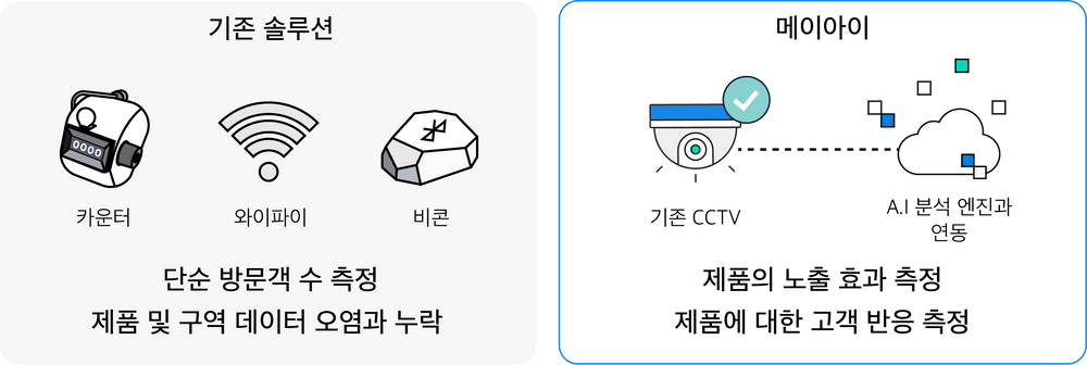 카운터, 레이저 센서 등. 예전부터 다양한 고객 분석 솔루션이 존재해 왔습니다. 그러나 기존 솔루션이 알려주는 정보는 '고객이 몇 명 방문했는가?' 정도에 그칩니다. 이를 보완하기 위해 와이파이나 비콘을 활용한 분석 솔루션을 사용하기도 합니다만, 이러한 솔루션은 핸드폰의 와이파이 혹은 블루투스를 활성화한 고객만 분석 가능합니다. 이를 비활성화 한 고객은 분석하지 못하므로 많은 데이터 누락이 발생합니다. 무엇보다 고객 위치를 파악할 때 10m 가량의 오차 범위를 갖기에, 제품에 대한 섬세한 고객 반응을 정확히 분석하기 어렵습니다.