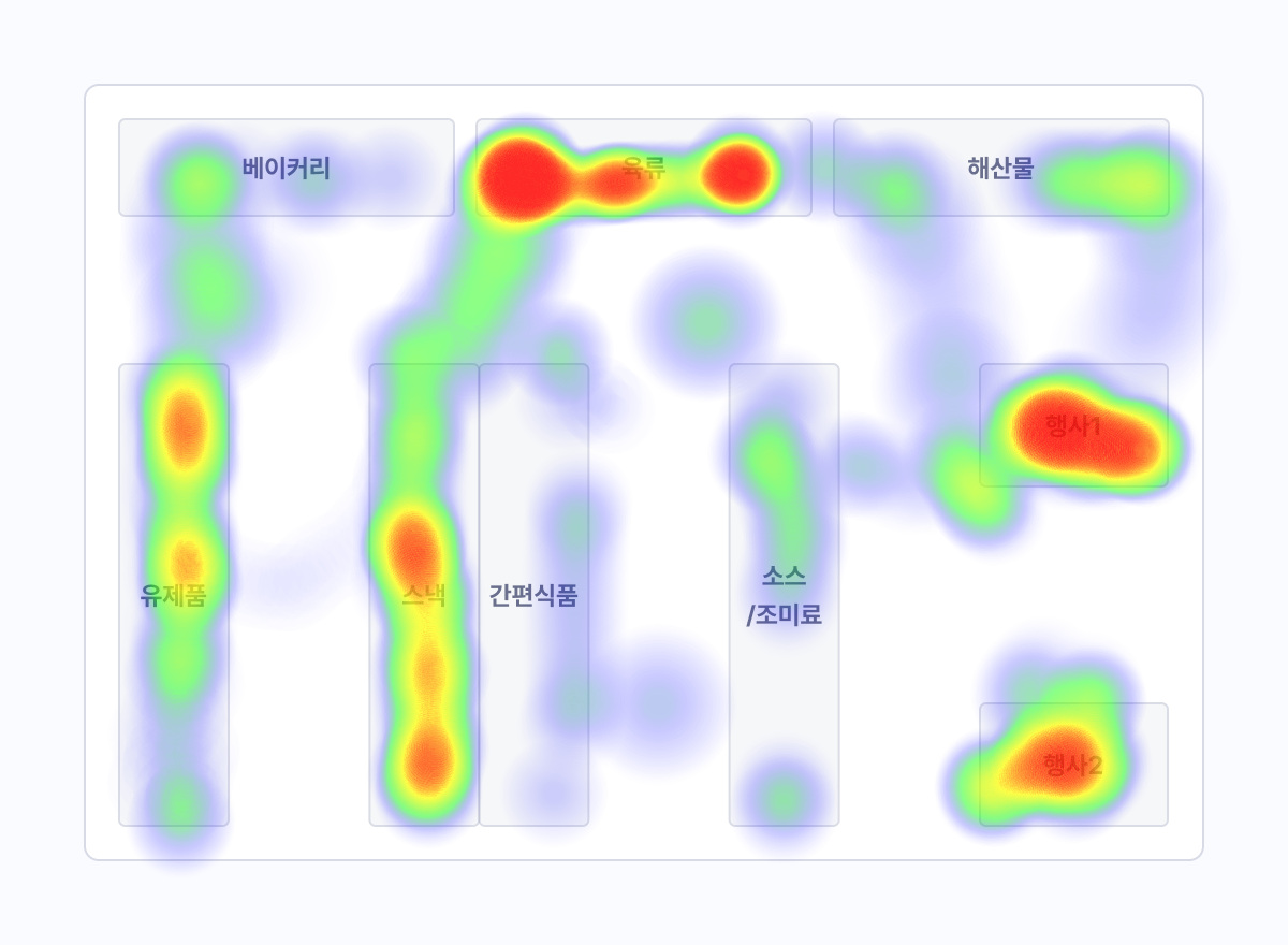 히트맵 또한 고객 동선 시각화 3종 세트 중 하나입니다. 매장 내부에서 어떤 부분에 방문객이 오래 머물고 아닌지를 직관적으로 확인할 수 있도록 돕습니다. 매장에서 가장 사람이 붐비는 곳(핫존)은 빨갛게 표시되고, 사람이 붐비지 않는 곳(데드존)은 파란색으로 표시됩니다. 히트맵을 기반으로 유료 매대를 핫존에 배치하면 됩니다. 이를 통해 대형마트는 데이터 중심으로 매대 이용료를 산정할 수 있고, 고객사는 상품 노출 효과를 객관적으로 확인할 수 있습니다.
