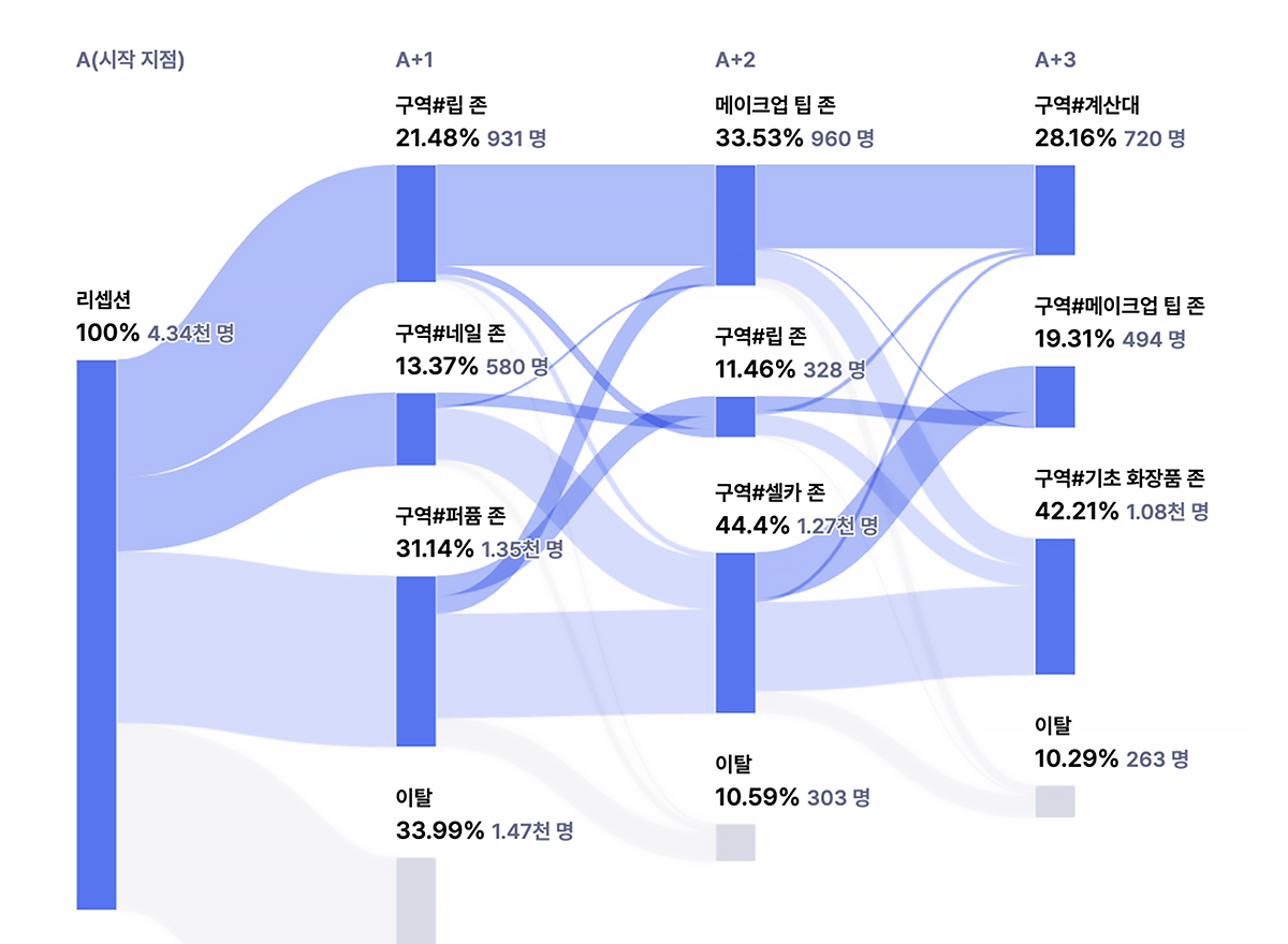 매장 방문객의 주요 동선은 매쉬보드에서 ‘저니맵(Journey map)’으로 파악할 수 있습니다. 저니맵에서는 방문객이 한 구역에서 어떤 구역으로 이동했는지, 어디에서 이탈했는지 등을 세부적으로 볼 수 있습니다. 예를 들어 뷰티 매장 방문객이 입장 후 어떤 콘텐츠를 가장 먼저 체험했는지, 계산대까지 가는 동안 어느 매대를 순차적으로 들렀는지를 확인할 수 있는 것입니다.