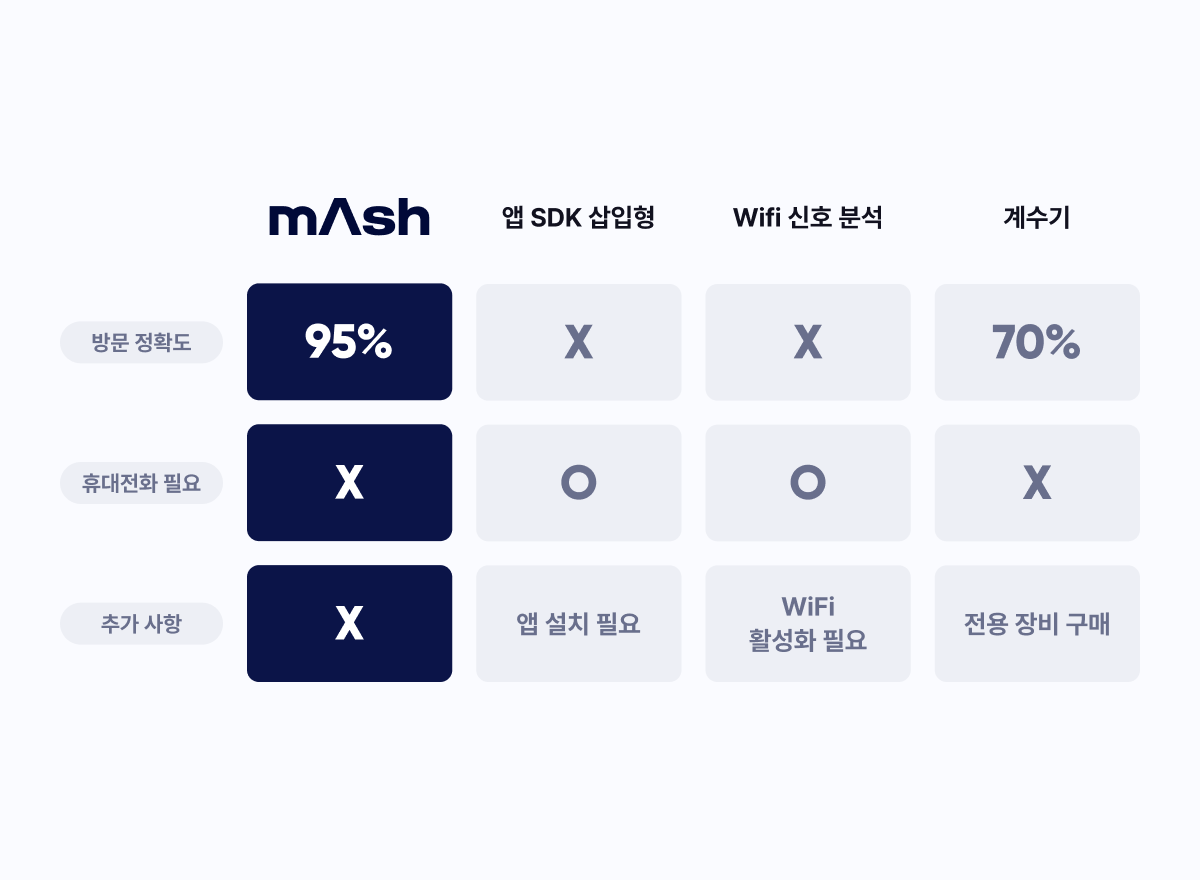 ‘다른 피플 카운팅 솔루션과 뭐가 다른가요?’ 메이아이가 자주 받는 질문 중 하나인데요. 매쉬의 방문객 카운팅 기능과 비교했을 때 타사 솔루션에는 제한되는 점이 있습니다.