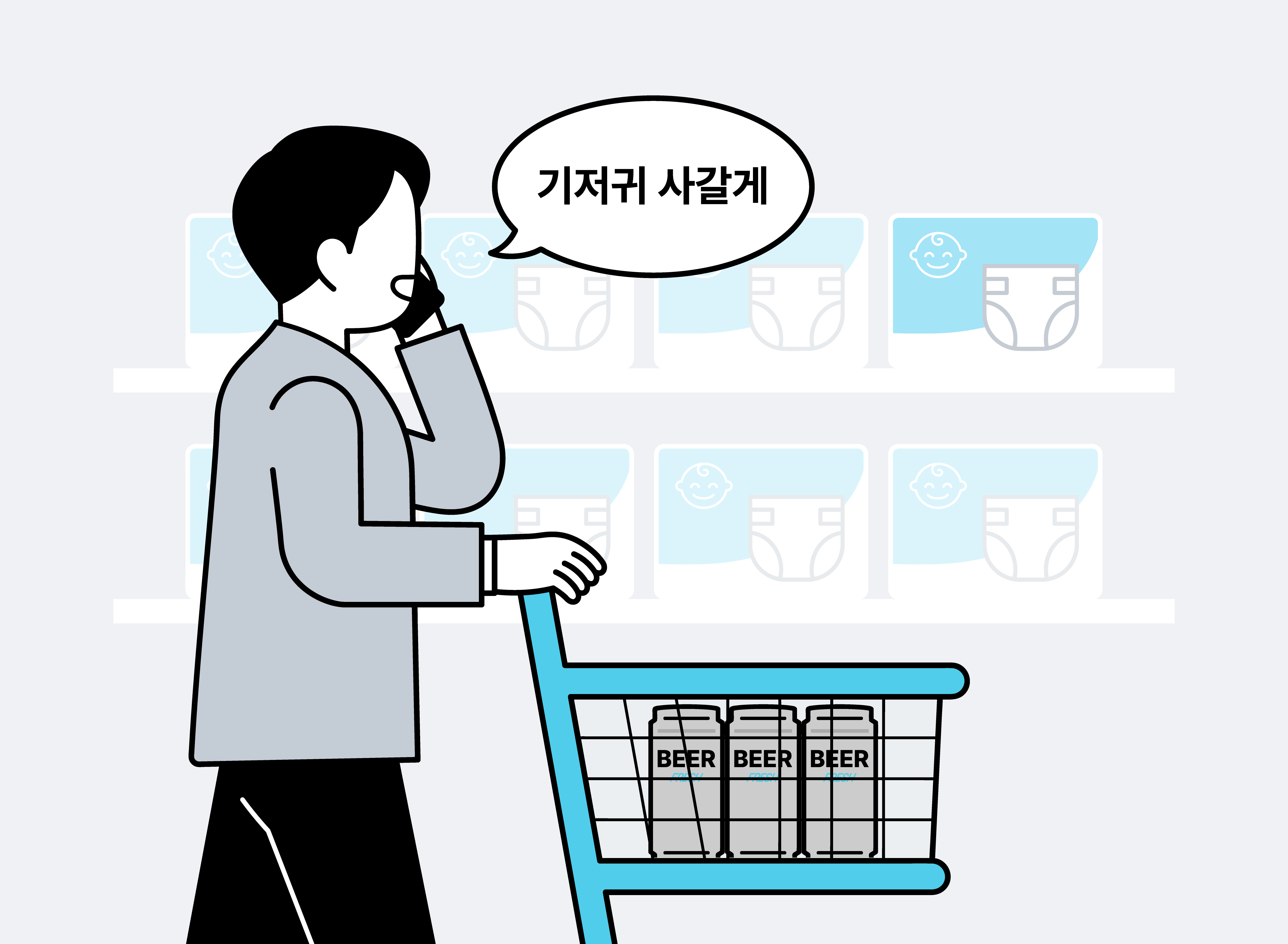 예상치 못한 패턴을 발견한 드럭스토어는 고민 끝에 남성 소비자에게 ‘보상 심리’ 혹은 ‘양심의 가책’이 작용한다는 가설을 세웁니다. 아기를 키우는 남성이 퇴근길에 기저귀를 사러 마트에 들르면 힘들었던 하루치 노동의 보상이나 아내의 심부름을 수행하는 대가로 맥주를 함께 구매하는 경향을 띄고요. 퇴근길에 맥주만 사러 마트에 들르기에는 아내 눈치가 보이니까 기저귀까지 같이 구매해서 귀가하는 경우가 많다는 거예요.