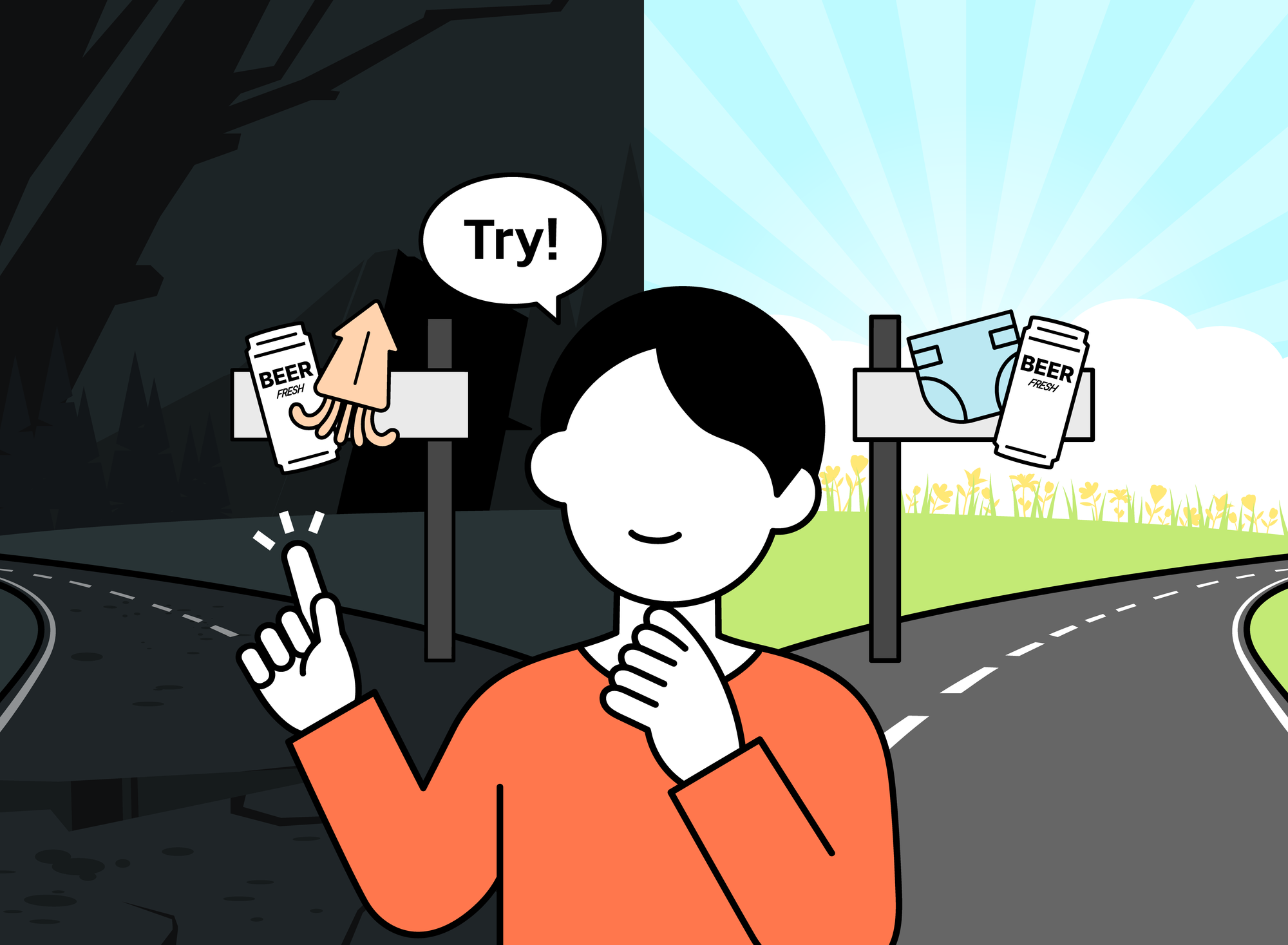 장담하는데, 아닐 겁니다! 실제 시장에는 맥주와 기저귀보다 맥주와 오징어처럼 동일 상품군으로 분류할 수 있거나, 맥주와 맥주잔처럼 상호 보완하는 묶음 상품이 더 많이 유통되고 있는데요. 이처럼 시장에서 살아남아 하나의 가닥으로 읽히게 된 흐름은 어느 정도 검증된 기획이라고 해석할 수 있어요. 그리고 ‘어디서 본 것 같은 조합’을 고안하는 전략은, 창의력 부족의 결과가 아닌 안정추구형 선택의 산물이라고 이해할 수 있죠. 말하자면 불확실한 실험의 뒤를 따르는 위험 부담을 줄이려는 태도라고 할까요?