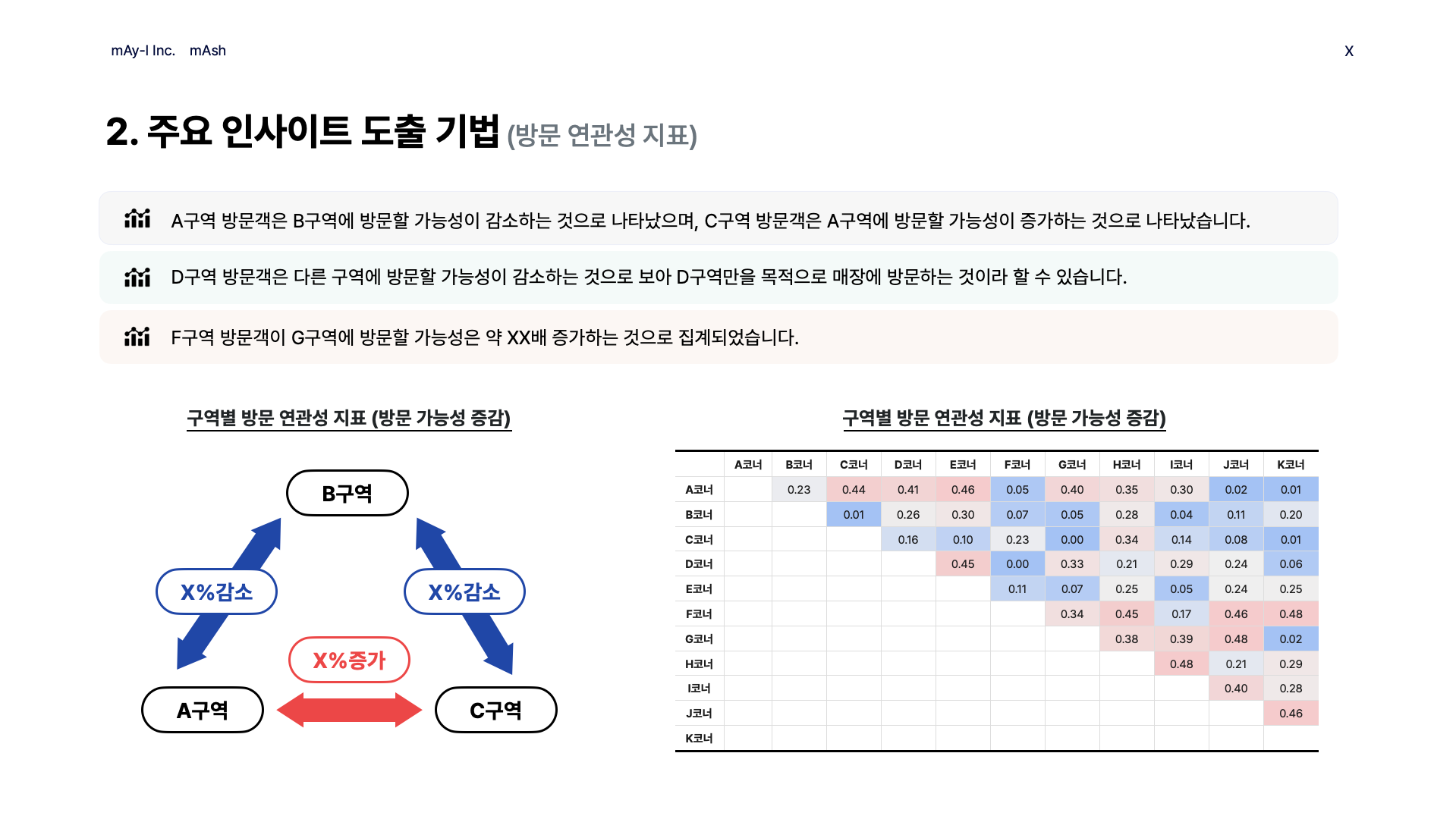 반면에 매쉬는 방문객의 동선과 체류 시간 등 ‘고객 경험’이라고 부를 수 있는 정보의 일체를 분석하고요. 이를 기반으로 기성의 데이터 마이닝 툴들이 놓쳤던 인사이트까지 잡아냅니다. 거기에 마케터님께서 매장이 보유한 구매 데이터를 더하신다면? 맥주와 기저귀 매대 사이의 연관성을 발견하는 것은 물론이고요. 두 가지 상품을 묶은 프로모션을 콕 집어 매장 어느 구역에서 진행할 건지, 프로모션은 어느 요일 어떤 시간에 진행할 건지 등의 심도 있는 운영 전략을 세울 수 있을 거예요. 나아가 소비자가 구매한 기저귀 브랜드는 A이지만, B가 유력한 경쟁사였다는 인사이트도 얻을 수 있겠습니다. 우와... 매쉬와 함께라면 ‘맥주와 기저귀’ 사례를 갈아 치울 새로울 장바구니 분석 사례를 만드는 것도 가능하겠는걸요...?
