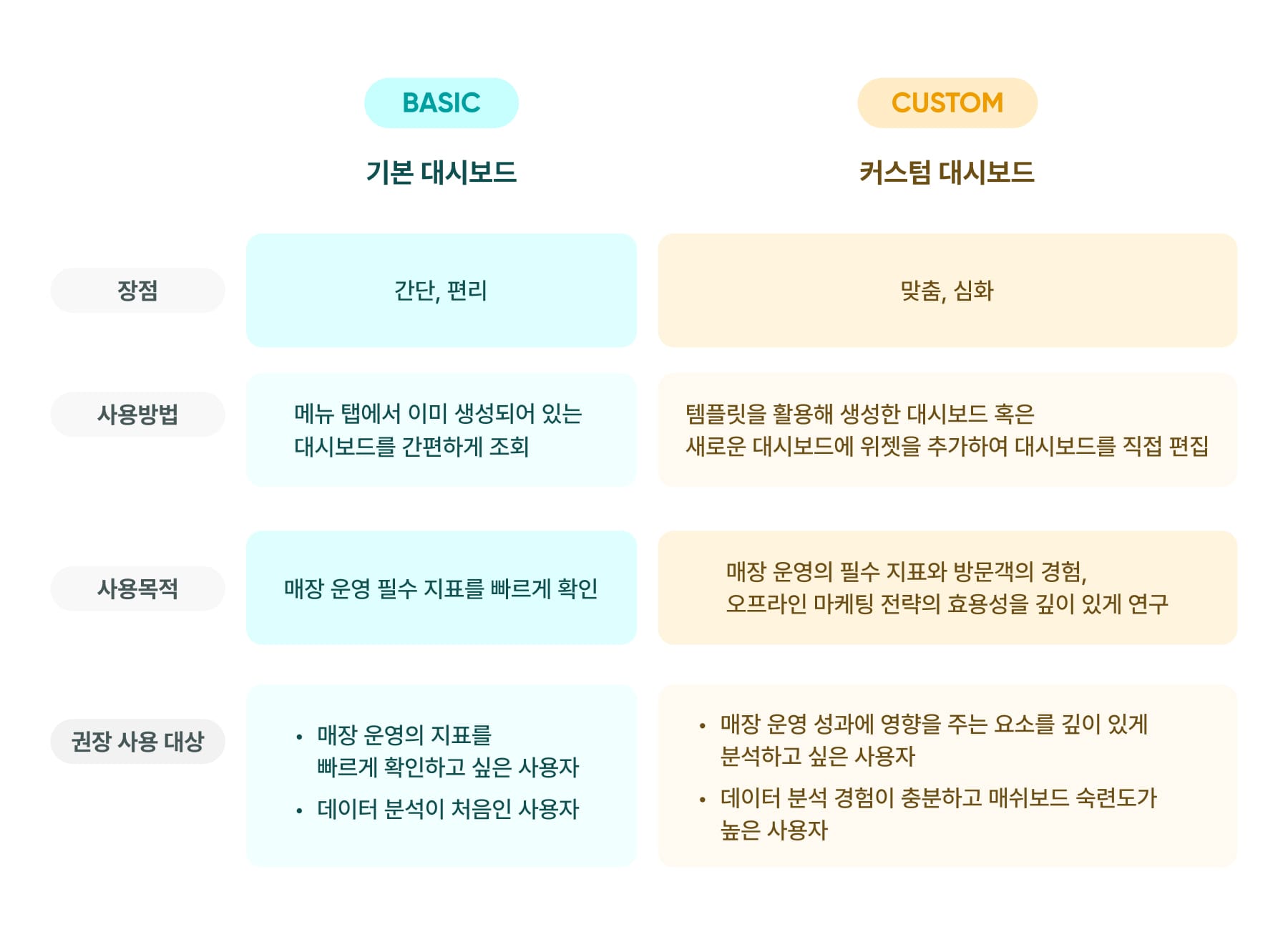 위에서 소개한 4종의 페이지는 매쉬보드 좌측 메뉴 탭에서 즉시 사용할 수 있도록 제공됩니다. 상기 4종의 페이지를 활용하면 대시보드를 일일이 생성하거나 직접 편집할 필요 없이 매장 운영의 필수 지표를 손쉽게 확인할 수 있습니다. 따라서 지표를 빠르게 조회하고 싶거나 데이터 분석이 처음인 사용자 혹은 매쉬보드 입문자에게 적극적인 이용을 권장합니다.