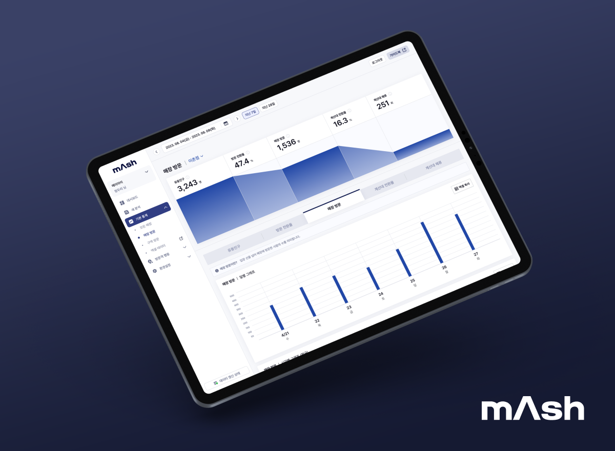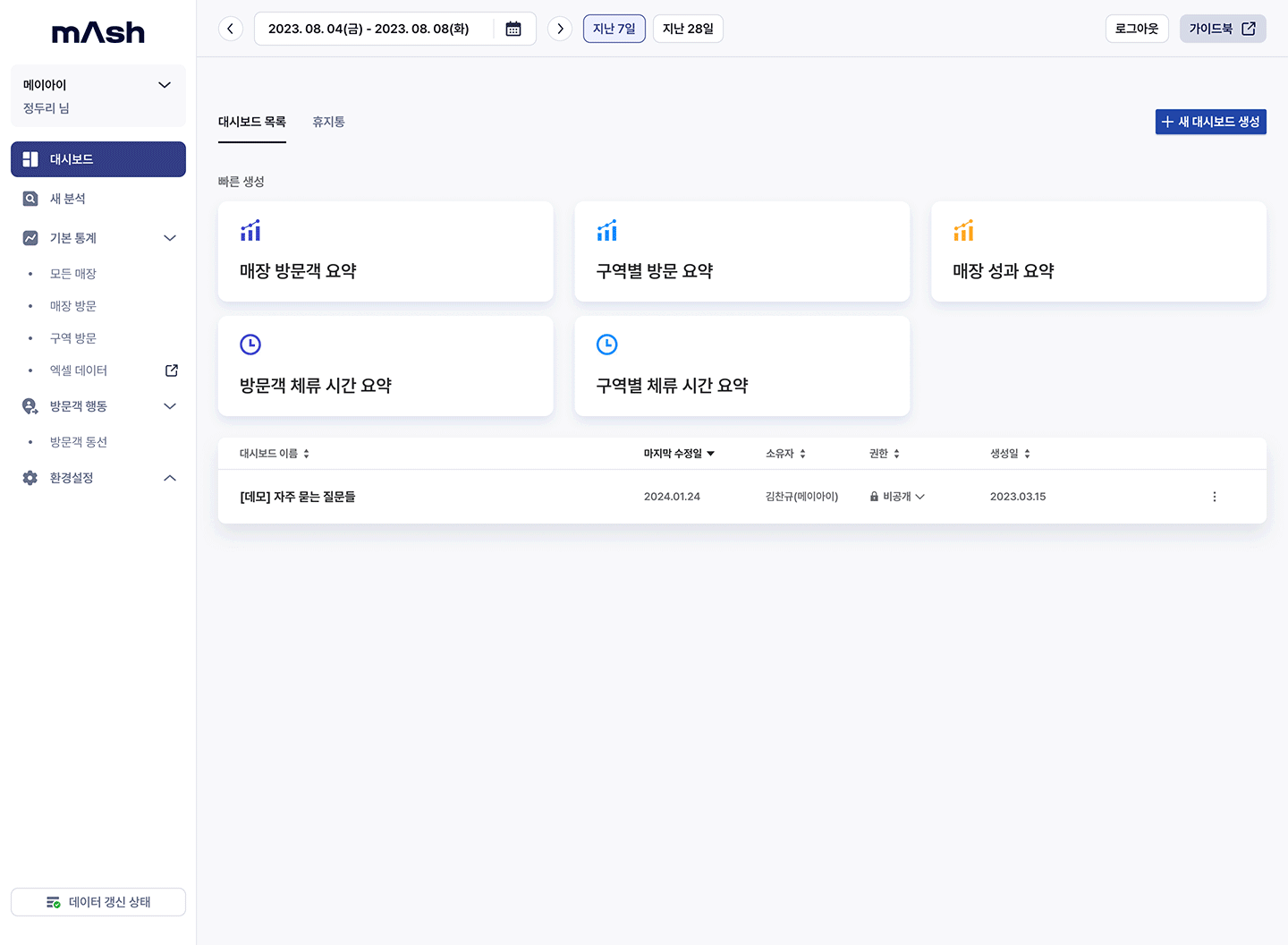 매쉬는 매장에 설치된 CCTV 영상을 통해 매장 방문객의 비정형적 데이터를 수집하고 분석합니다. 매쉬가 분석한 직후의 데이터는 통계의 형태를 갖추고 있지만, 아직까지 고객사가 조회하거나 사용하기 쉽지 않은 날 것에 가깝습니다. 따라서 매쉬가 도출한 데이터는 고객사에게 전달되기에 앞서 시각화 과정을 거쳐야 합니다. 이때 사용되는 것이 바로 메이아이가 개발한 웹 대시보드인 ‘매쉬보드’입니다.