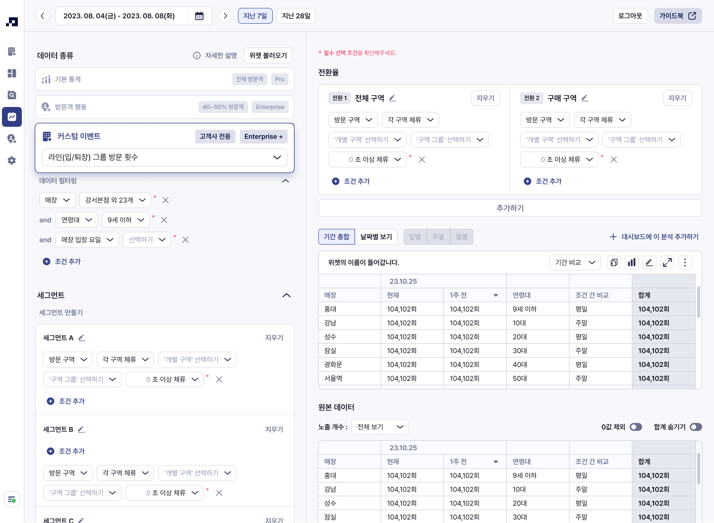 매장 앞 유동 인구, 그중 매장을 방문한 사람의 수와 그 비율, 매장 방문객 중 구매가 일어난 비율 등. 방문객과 구매에 해당하는 핵심 KPI를 제공합니다. 고객사는 매장의 성과를 파악하고 병목을 찾아내어 개선하거나 주요 방문객의 정보를 파악하여 매장 구성 혹은 마케팅 전략을 최적화할 수 있습니다.