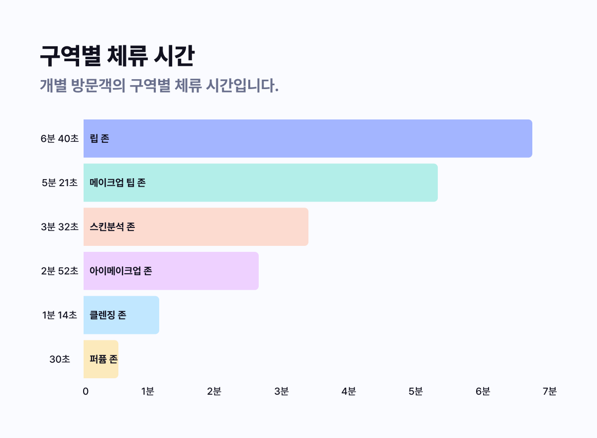 구역별 체류 시간을 알 수 있는 것도 장점입니다. 브랜드 헤리티지 전시존이나, DIY존처럼 체류 시간이 길 것으로 예상되는 경우에 적합합니다. 체류 시간이 낮게 나오면, 해당 구역의 콘텐츠의 매력이 떨어졌거나 즐기기 어려운 요인이 있었다고 볼 수 있습니다. 또한 체류 시간을 성별·연령대별로 확인할 수 있어서, 타깃 방문객이 제대로 즐겼는지도 확인 가능합니다.