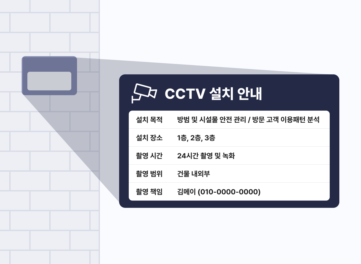 개인정보보호법에 의해 공공장소에 CCTV를 설치할 경우 설치 현황과 목적을 안내해야 합니다. 팝업스토어에 설치될 CCTV도 마찬가지로 안내 대상에 포함됩니다.