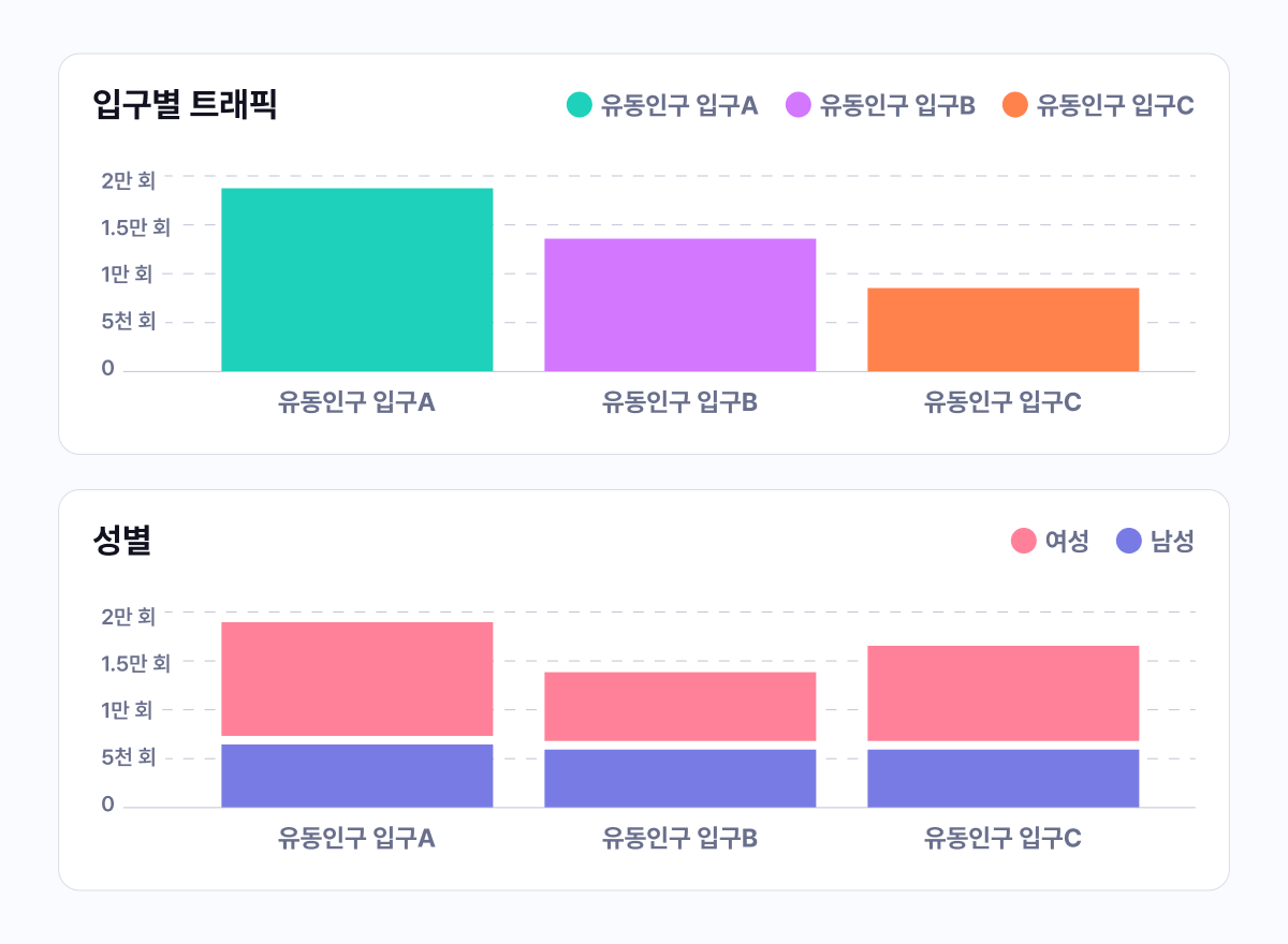 방문객 수, 연령대, 성별 등의 기초 데이터를 제공합니다. 매대 체류 시간 및 방문객 동선 등의 데이터도 제공 가능하며, 제공하는 데이터는 연령대와 성별에 따라 세부적으로 살펴볼 수 있습니다. 예를 들어 특정 구역에 가장 오랜 시간 체류한 연령대·성별의 비율을 파악하는 식입니다.