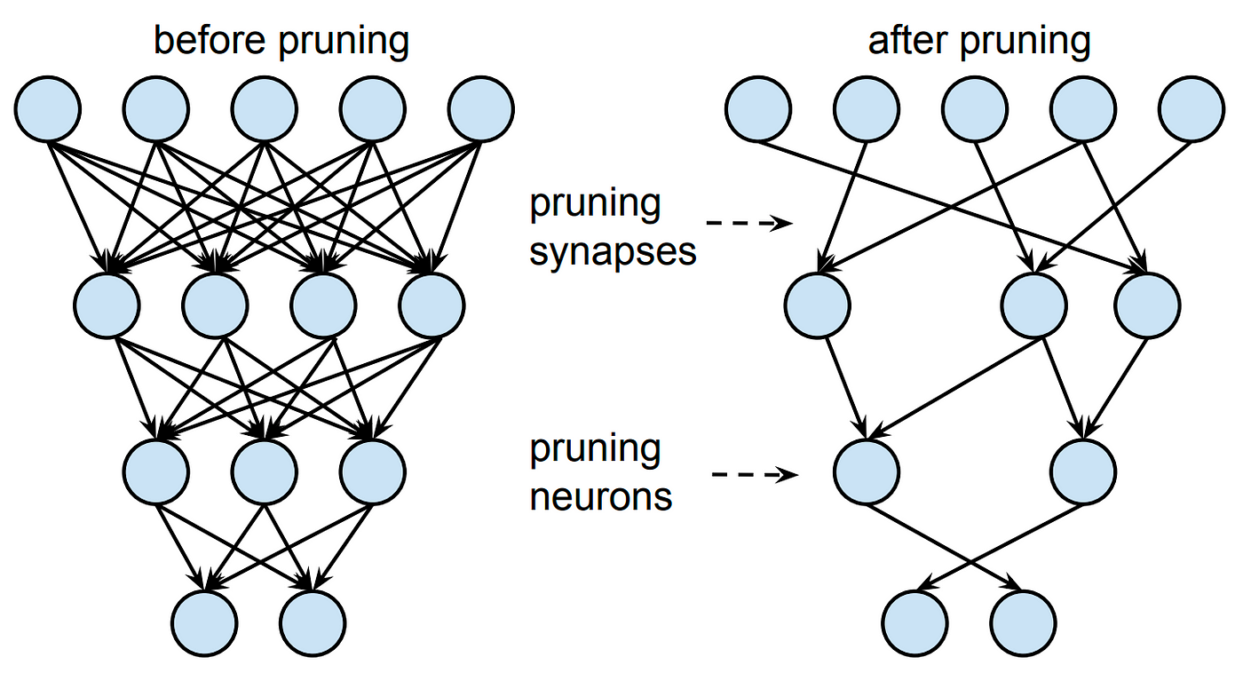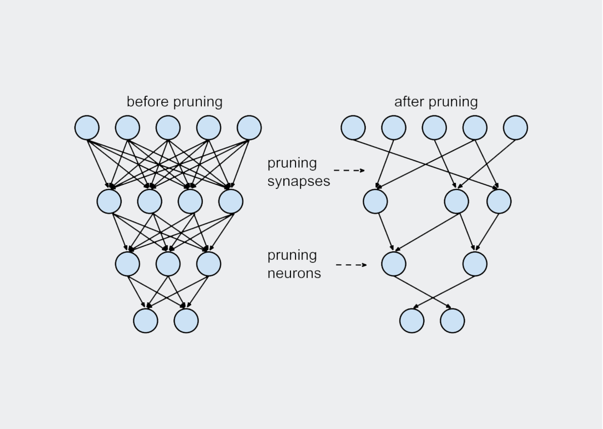 하지만 Pruning을 사용한다면 어떨까요? 저희는 현재 사용하고 있는 모델이 있으므로, 해당 모델의 parameter를 전부 불러온 다음 간단하게 가중치들의 중요도를 산정합니다. 그리고, 해당 가중치들을 바탕으로 일정 중요도 이하, 혹은 하위 몇 % 이하의 중요도 수치를 가진 가중치들을 모델 그래프에서 제거한 뒤, fine-tuning을 진행합니다. 이렇게 되면 위에서 말씀드렸던, 처음부터 모델 구조를 찾는 것과 비교하여 몇 가지 장점이 있습니다.