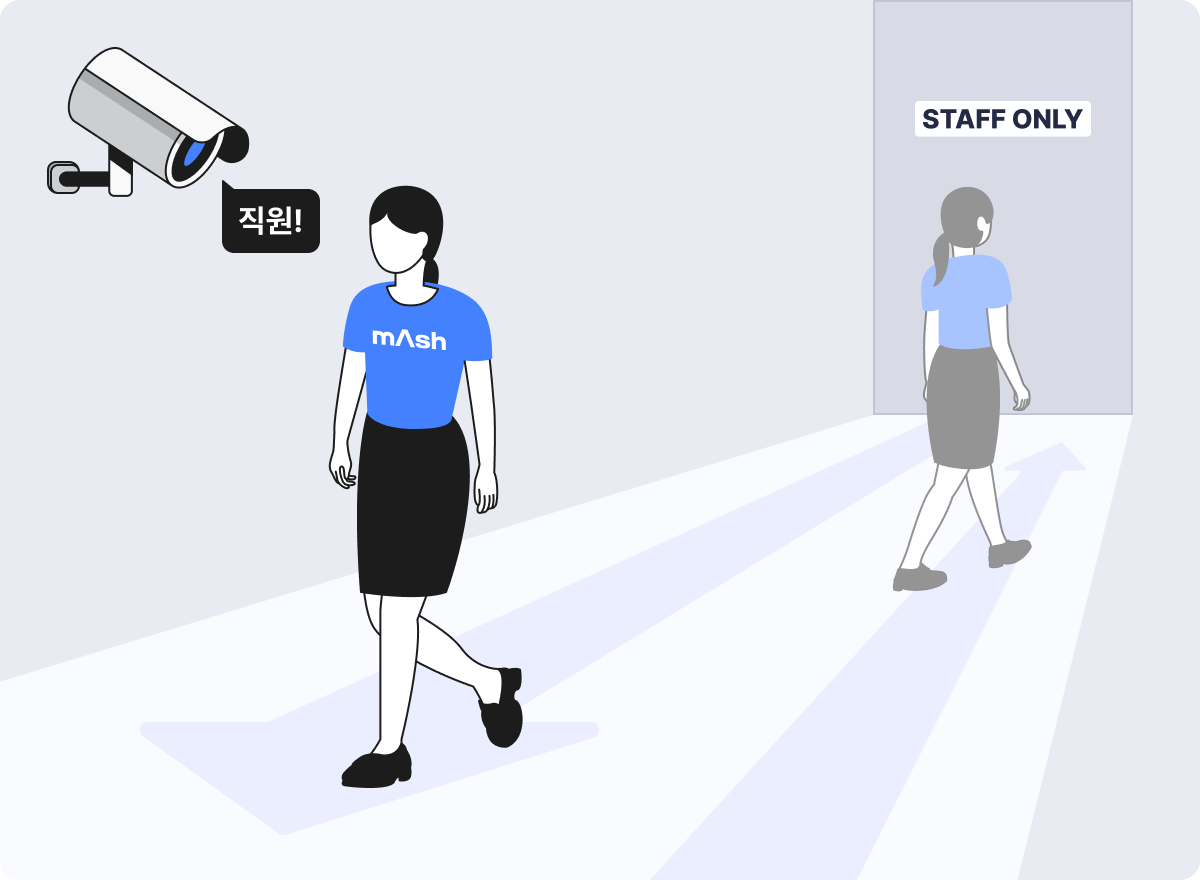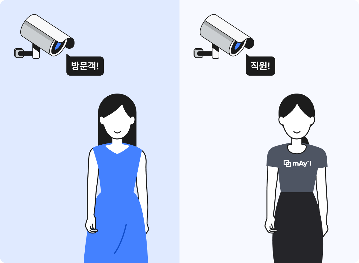 메이아이에서는 동선 추적 기능을 통해 서로 다른 시점에 등장한 인물의 복장이 동일한지 여부를 파악합니다. 이러면 유니폼이 없거나 일반 옷차림과 큰 차이가 없는 공간에서도 직원을 구분하는 작업을 진행할 수 있습니다.