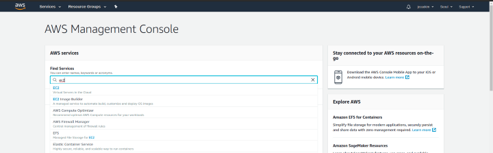 먼저 AWS console에 로그인해 줍니다. 계정이 없다면 하나 만들어주세요. 새로 생성한 계정에 한하여 무려 12개월간의 Free Tier 서비스를 이용할 수 있는 권한을 줍니다. 그리고 다음과 같이 Find Services에 “EC2”를 검색하여 EC2 서비스로 접속해 주세요.