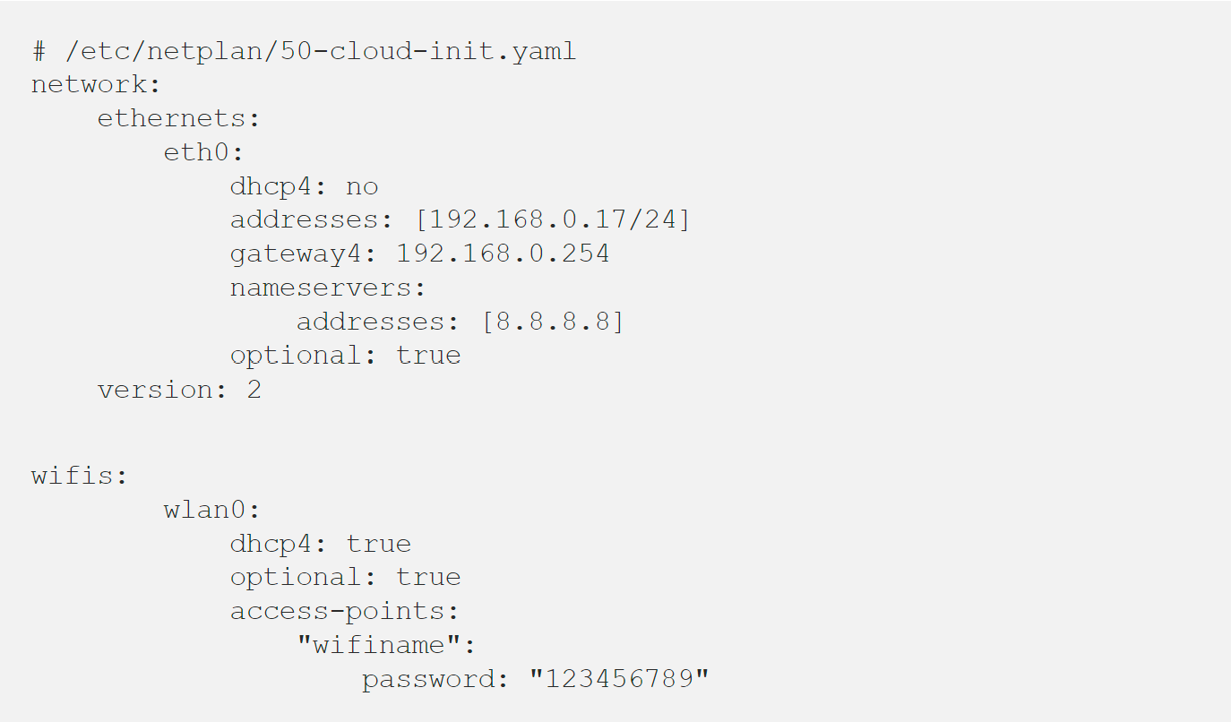 ethernets은 라즈베리파이에 UTP 케이블을 연결 후 고정 ip를 설정해야 할 경우 설정법이며 wifis는 와이파이를 설정하는 방법입니다.